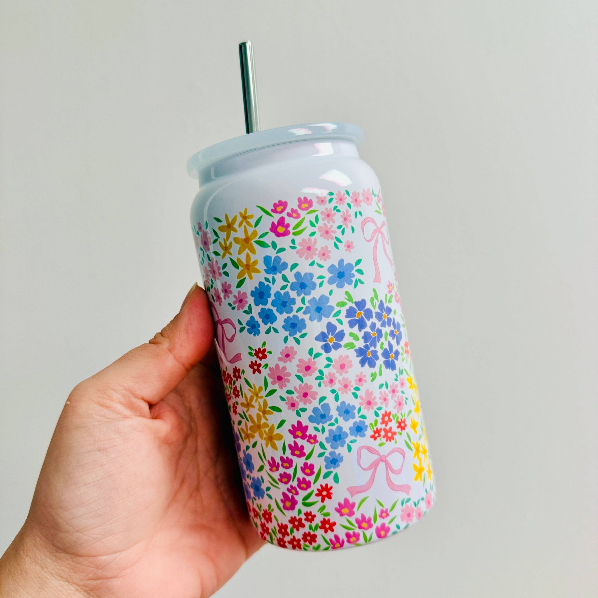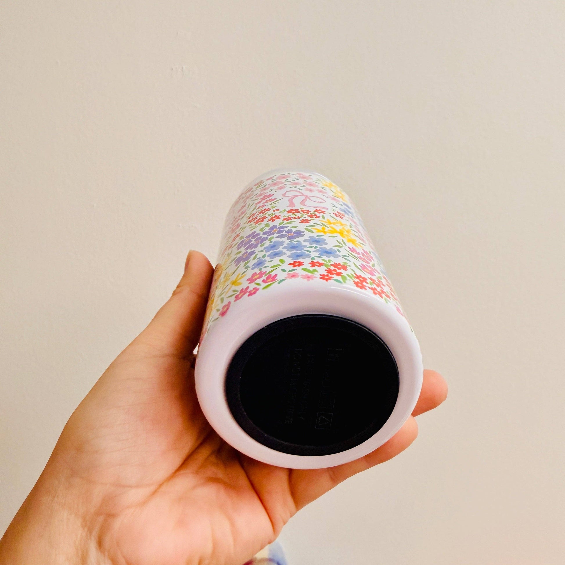 This tumbler has a colorful ditsy floral pattern with cute bows all the way around.