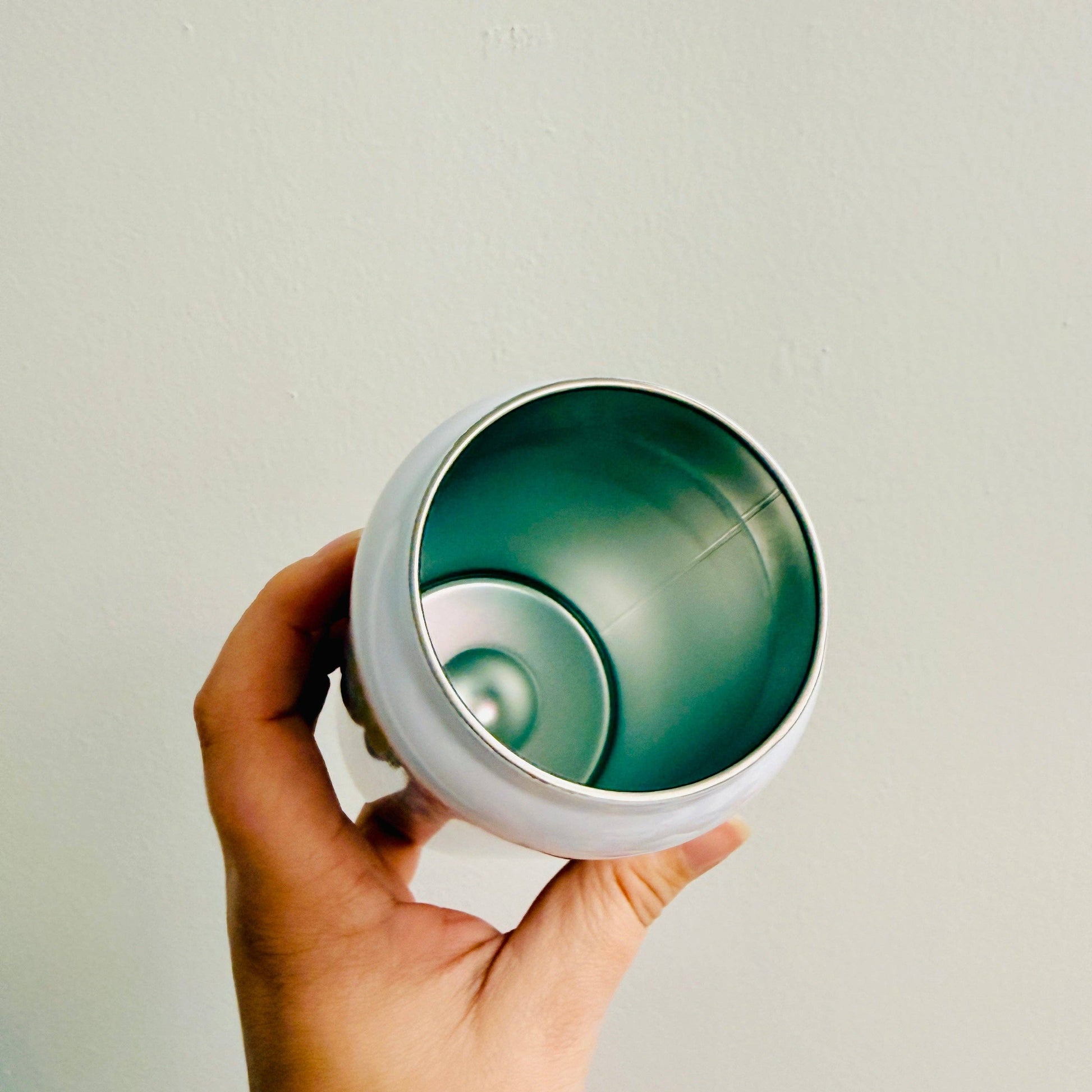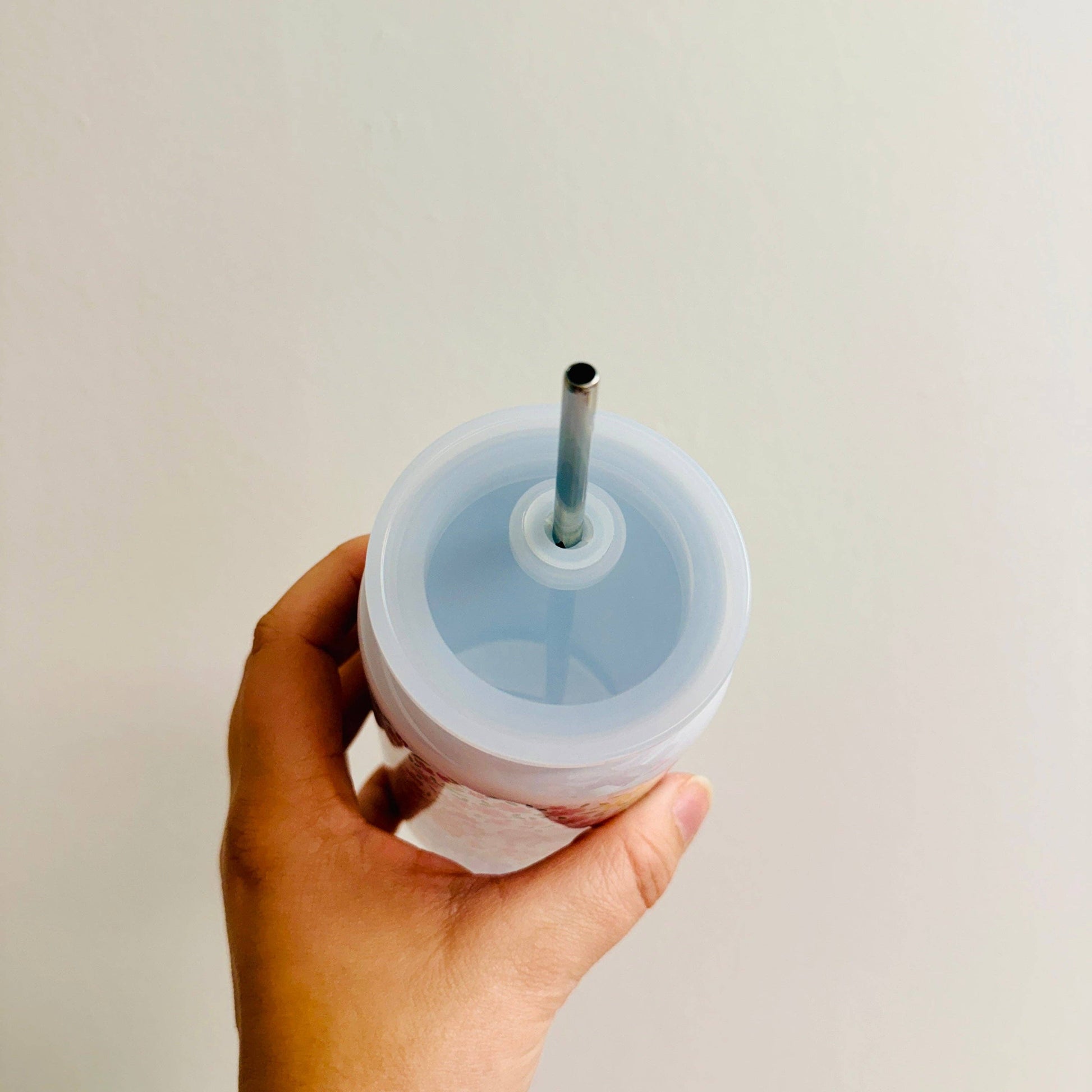 16 oz stainless steel can glass style tumbler with white lid and metal straw.