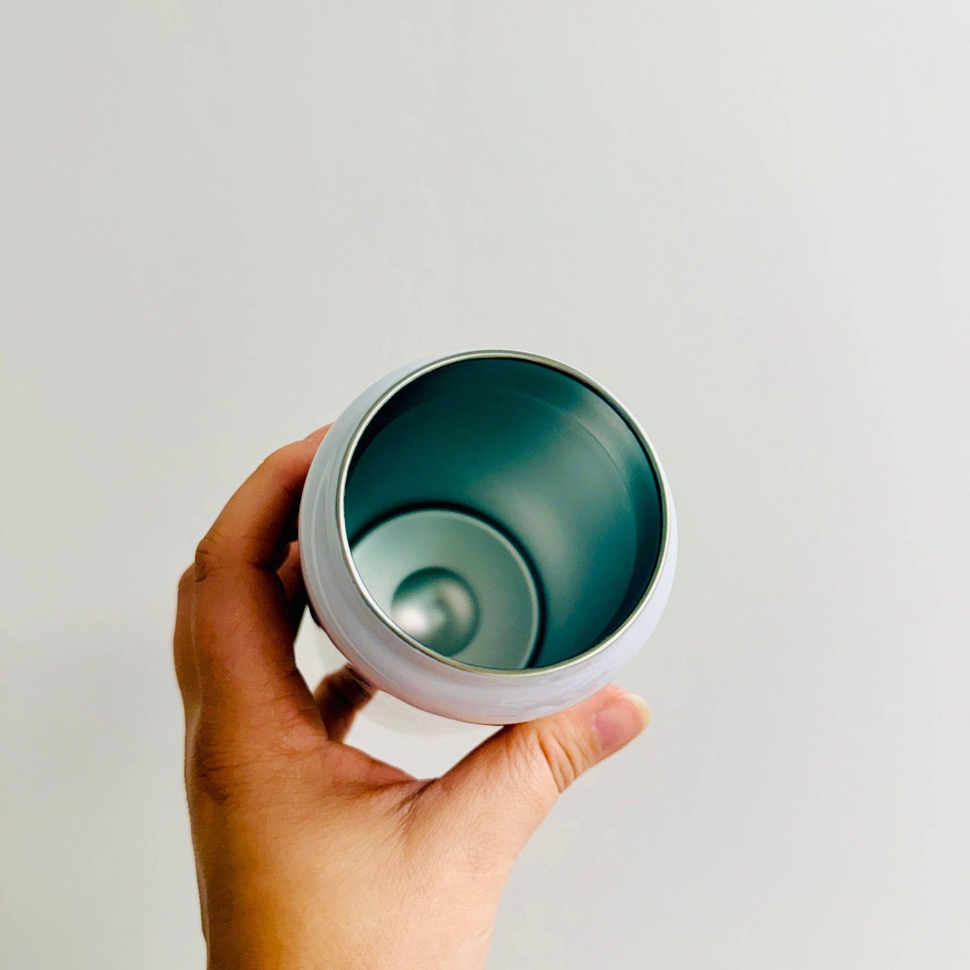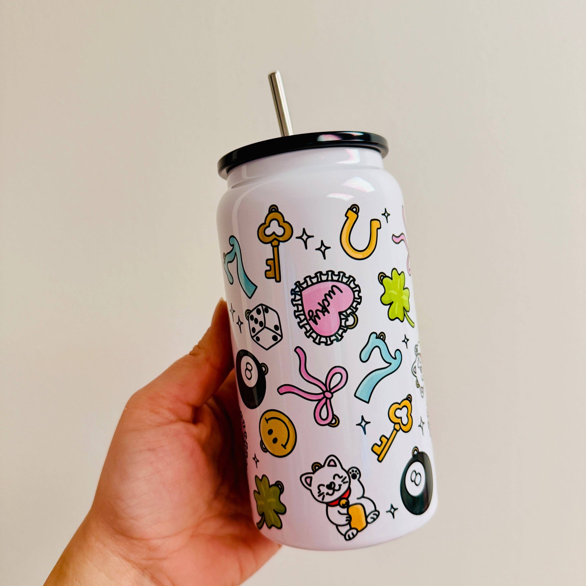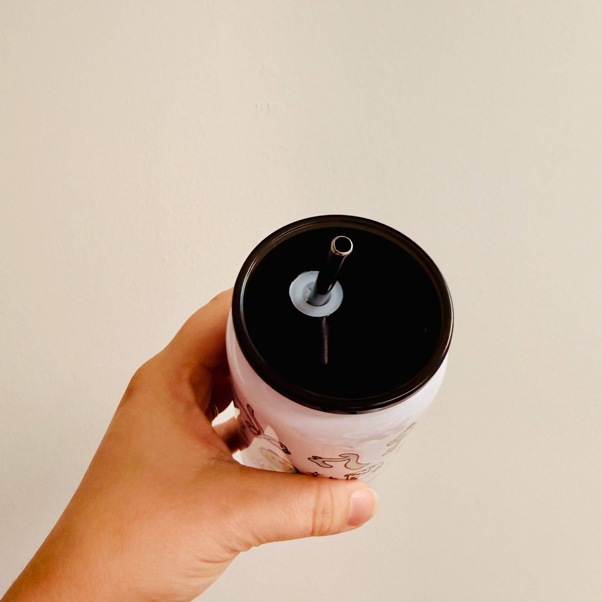 16 oz stainless steel can glass style tumbler with black lid and metal straw.