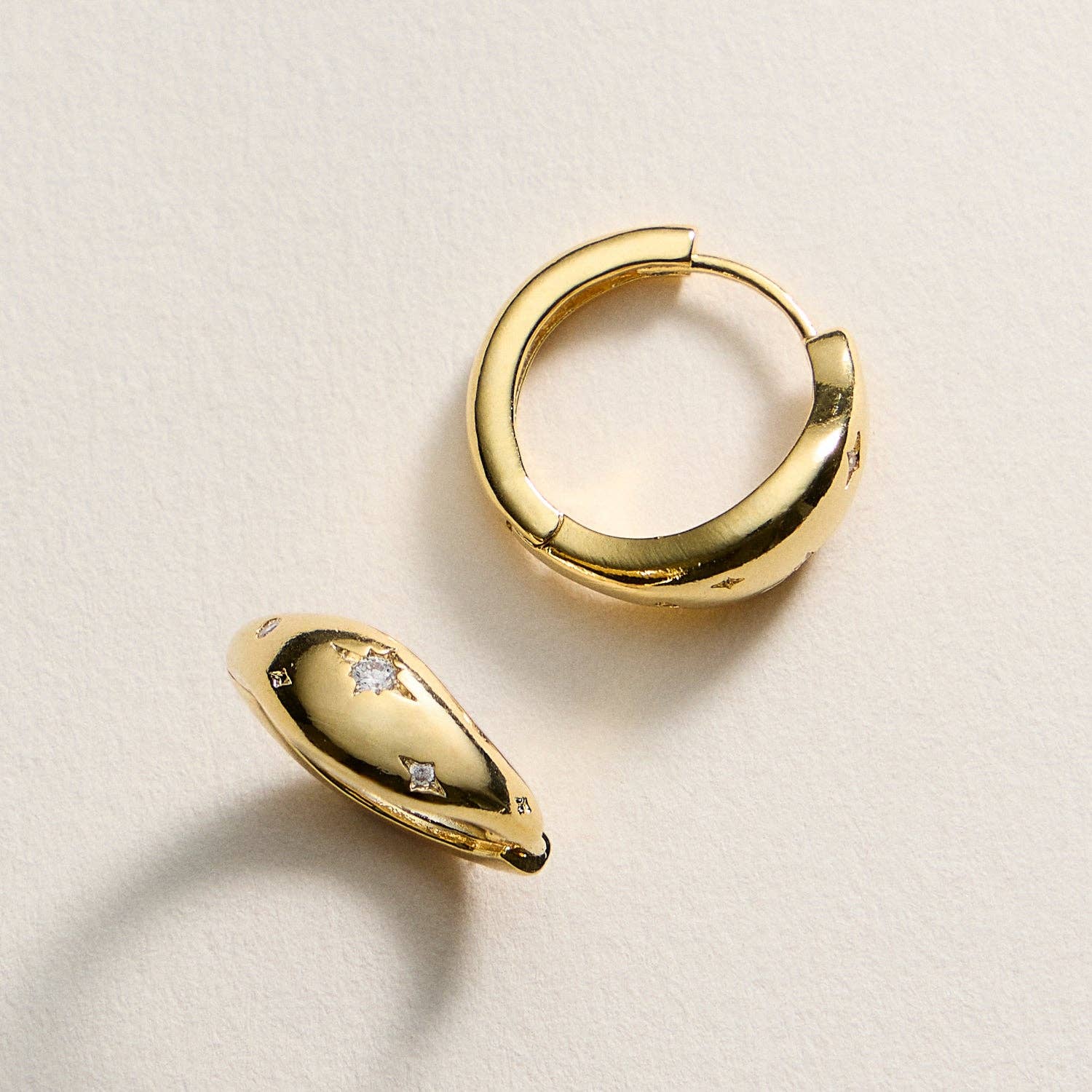 Shine bright with these gold-dipped hoop earrings featuring delicate star-shaped cubic zirconia accents. Their polished dome design adds a modern yet timeless touch, making them perfect for both everyday wear and special occasions. Lightweight, elegant, and effortlessly stylish, these hoops are a dazzling addition to any jewelry collection.
