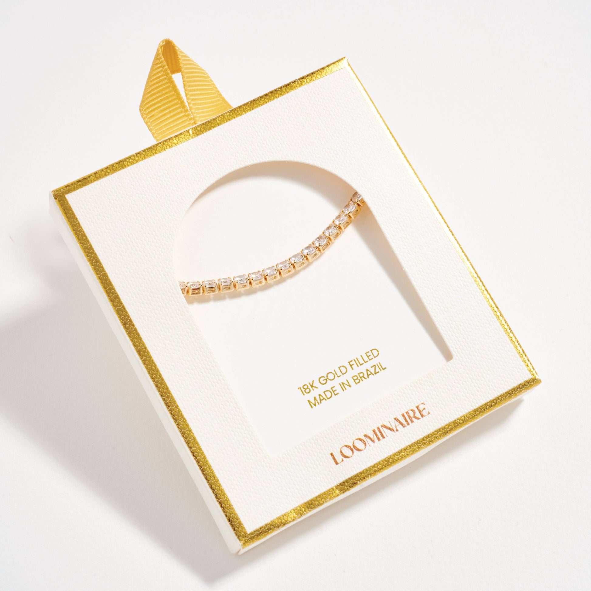This gold-filled tennis bracelet features a stunning row of round-cut cubic zirconia stones, offering timeless sparkle and elegance.
