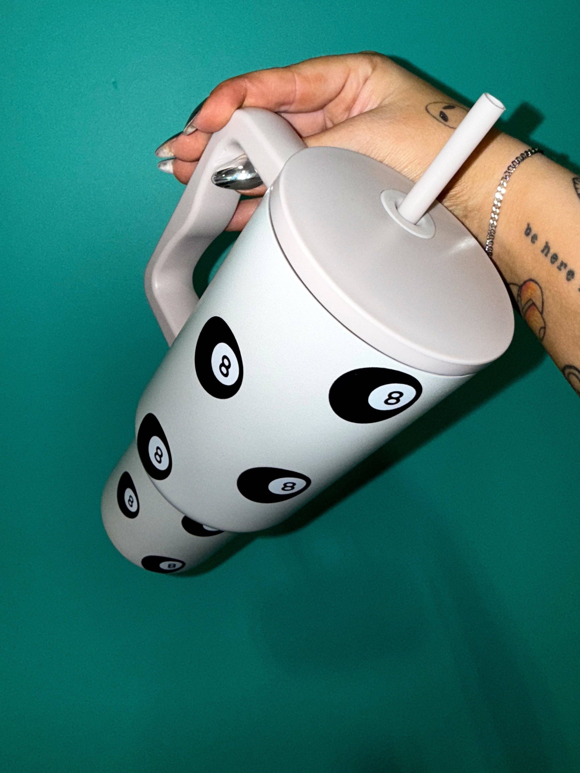 Level up your drink game with the No Hard Feelings Tumbler! This 30oz stainless steel tumbler combines functionality with retro-inspired style, featuring a sleek matte finish adorned with a pattern of iconic black-and-white 8-ball designs.