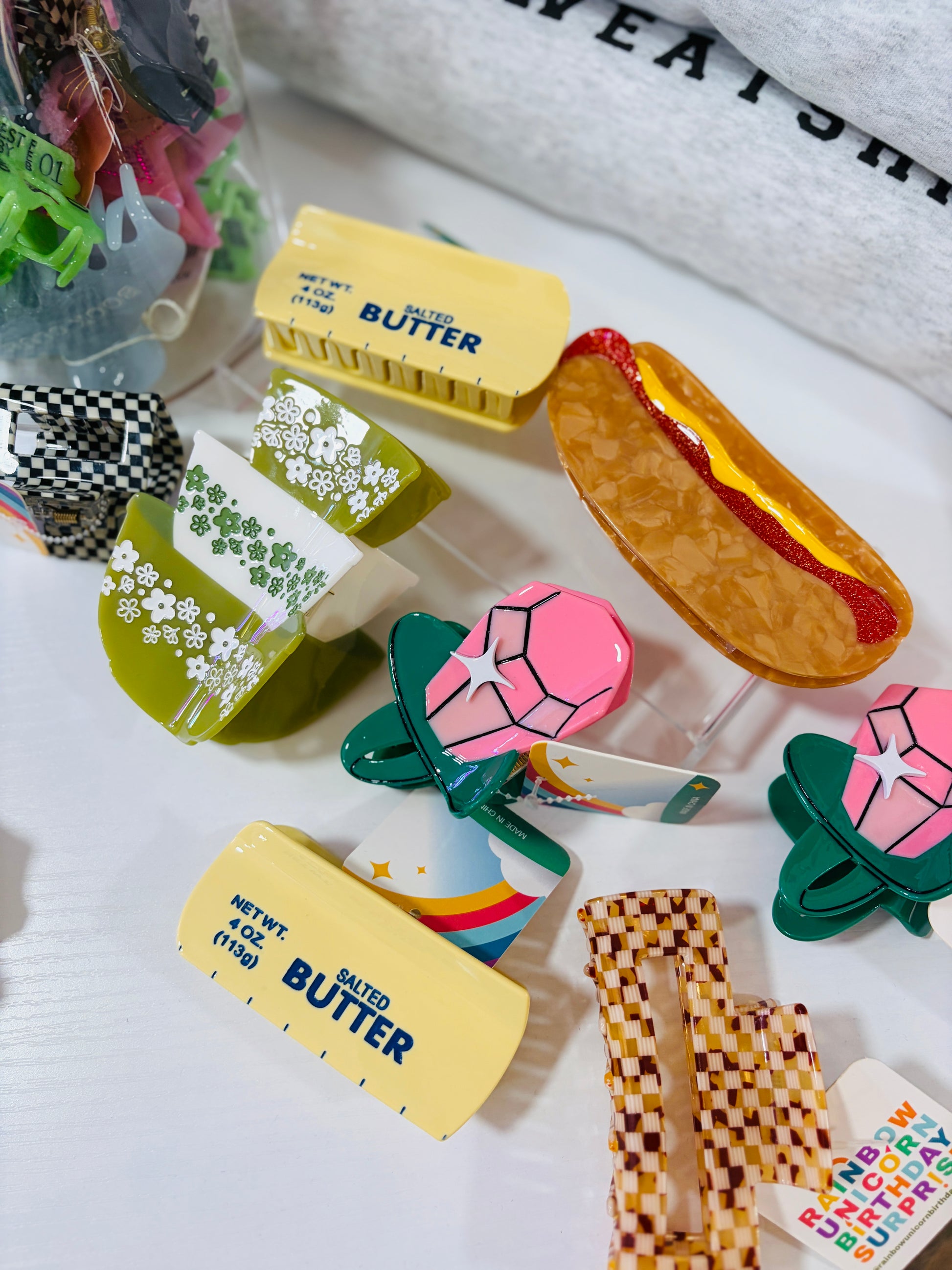 Add a tasty twist to your hairstyle with the Salted Butter Stick Hair Claw Clip—a quirky and whimsical accessory that’s as delightful as your favorite dairy staple. This oversized claw clip is shaped like a classic stick of salted butter, complete with playful packaging details, making it perfect for foodies, novelty lovers, or anyone who enjoys a good laugh with their fashion. It’s functional too, offering a strong grip for all hair types while delivering a buttery-smooth style statement.