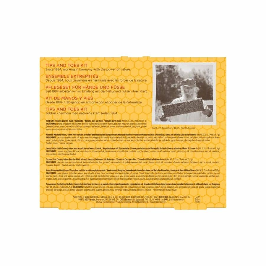 Pamper hands and feet with Burt's Bees® Tips and Toes Gift Set which includes 5 trial size hand and foot favorites, plus a Pomegranate Lip Balm. Almond and Milk Hand Cream, Honey and Grapeseed Hand Cream, and Hand Salve moisturize dry hands, while Lemon Butter Cuticle Cream softens cuticles and nourishes nails. Feet also get spoiled with rejuvenating Coconut Foot Cream, and you can kiss dry lips goodbye, and add a hint of color, with revitalizing Pomegranate Lip Balm. This Burt's Bees® Tips and Toes Kit provides serious softening and hydrating for dry skin, and makes the perfect birthday or holiday present. Plus, the sweet packaging is designed to be gift ready so you can skip the wrapping. Give the gift of nourishment with Burt's Bees® gift sets.