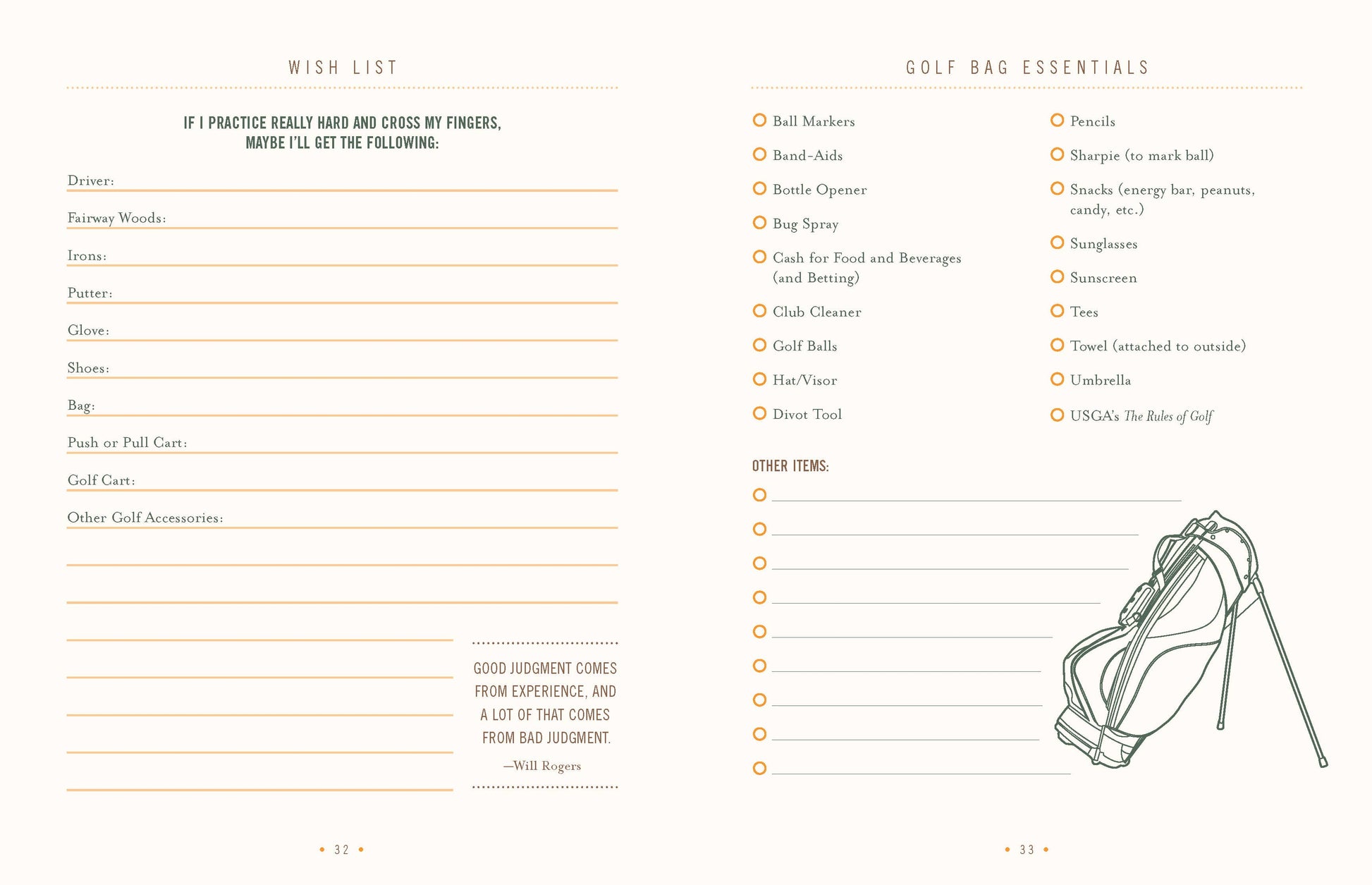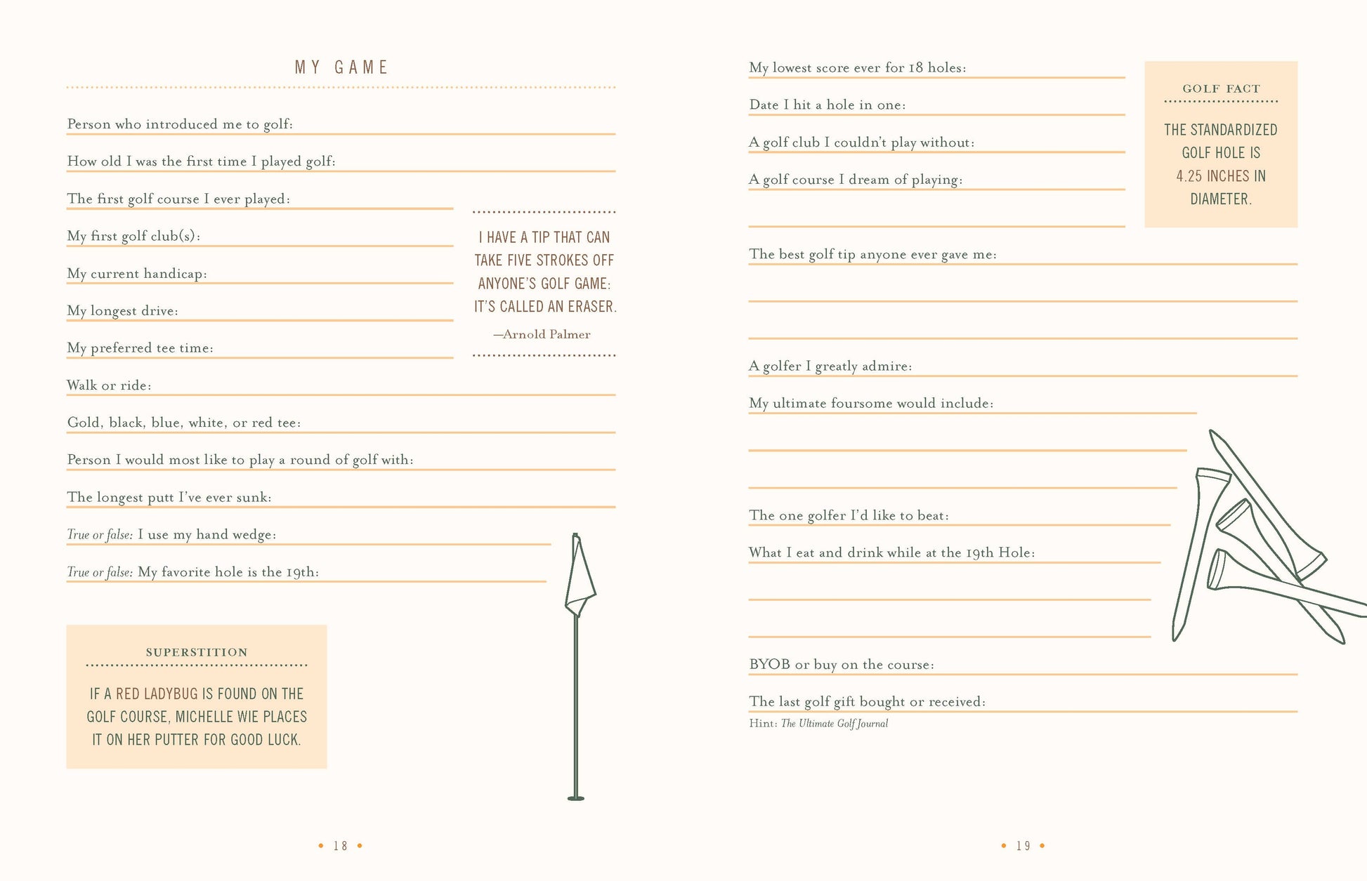 This classy journal contains all the tools and guidance a golf enthusiast of any level could ask for, from score sheets to practice range records and equipment logs, as well as sections to record local course information, golf advice, and your favorite 19th holes. Now, with everything you need to know in one place, you're sure to take strokes off your game in no time!